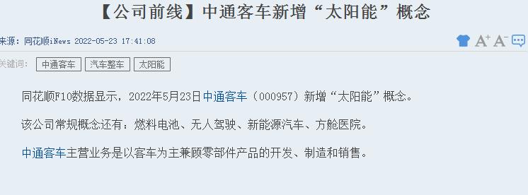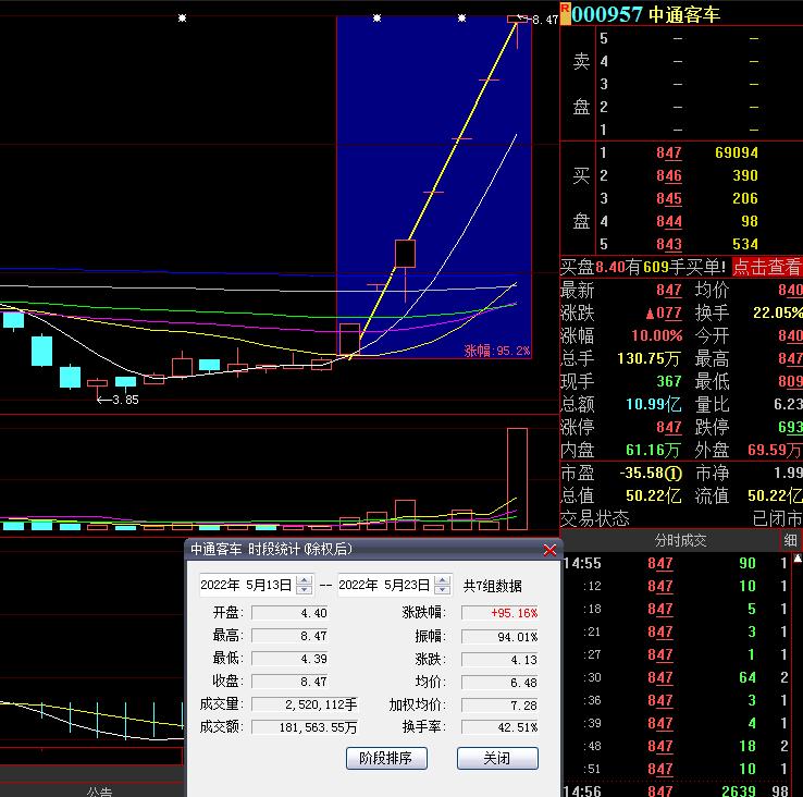 5月23日,中通客車再度漲停,截至收盤,報8.47元,總市值達(dá)50.22億元,連續(xù)7個交易日漲停,期間累計漲達(dá)95.16%。