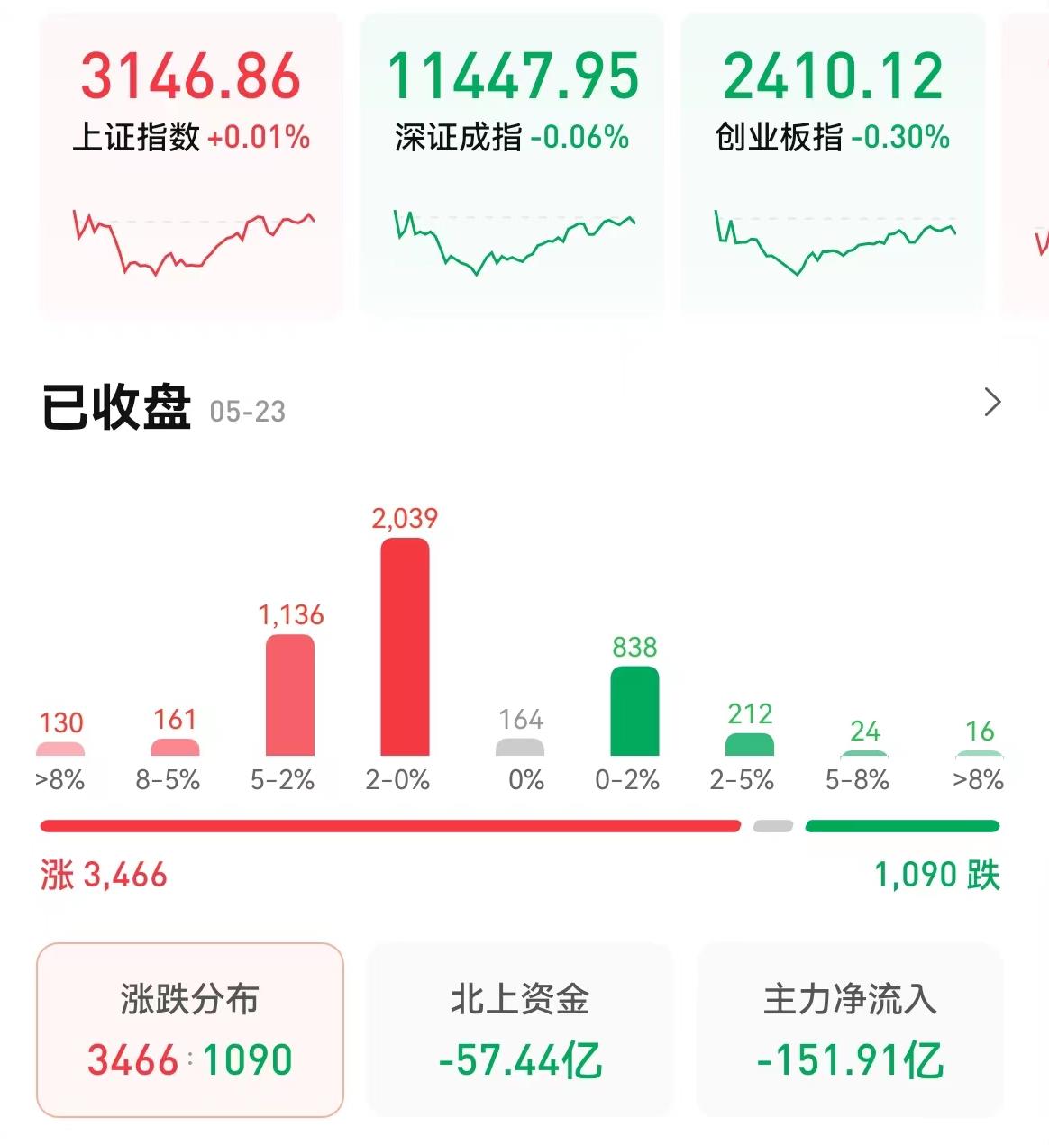 5月23日,三大股指漲跌不一,截至收盤,上證指數(shù)漲0.01%報3146.86點,深證成指跌0.06%報11447.95點,創(chuàng)業(yè)板指跌0.3%報2410.12點;滬深兩市合計成交額8597億元;北向資金凈賣出57.44億元;總體來看,兩市個股漲多跌少,上漲個股達(dá)3466只,有1090只個股下跌。