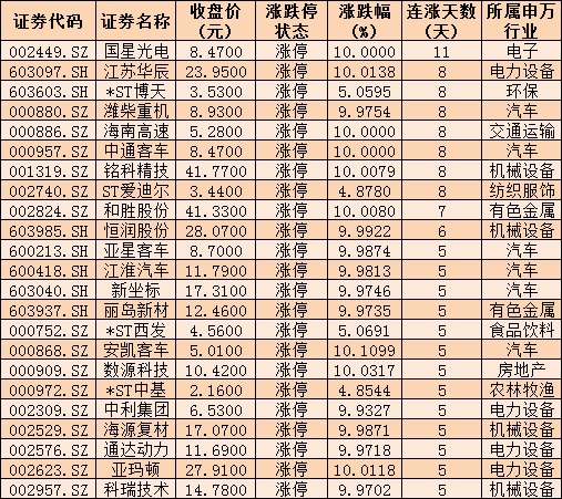 漲停板方面,5月23日,有115只個股漲停,其中,有23只漲停股,股價已連續(xù)上漲5個交易日以上。從行業(yè)方面看,汽車行業(yè)漲停股最多,達(dá)15只,緊隨其后的是傳媒和醫(yī)藥生物等行業(yè),漲停股數(shù)量均為11只。