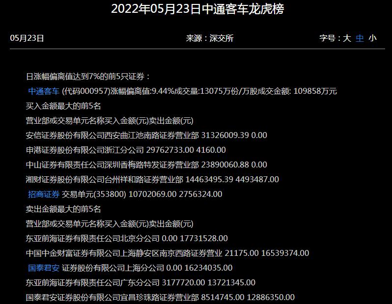 大智慧數(shù)據(jù)中心顯示,5月23日,中通客車(000957)收盤價:8.47元,漲跌幅:10.00%,成交金額:109858.36萬元,換手率:22.05%。當(dāng)日營業(yè)部凈買入3749.14萬元,凈買入占比3.41%。