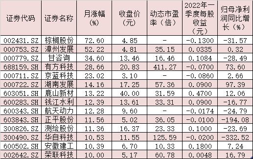 5月份以來,水利建設(shè)板塊表現(xiàn)活躍,其整體上漲2.42%,跑贏上證指數(shù)(月內(nèi)累計(jì)漲幅0.78%)。其中,有14只概念股期間累計(jì)漲幅超過10%,棕櫚股份期間以72.60%的漲幅排名第一,漳州發(fā)展緊隨其后,期間累計(jì)漲幅也達(dá)52.22%,甘咨詢、有方科技、京藍(lán)科技等3只概念股月內(nèi)累計(jì)漲幅也均在20%以上,表現(xiàn)強(qiáng)勢(shì)。