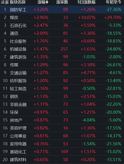 從申萬一級(jí)行業(yè)看,有23類行業(yè)上漲,國(guó)防軍工行業(yè)領(lǐng)漲,漲幅達(dá)3.26%,煤炭、石油石化和通信等3行業(yè)漲幅均在2%以上。此外,綜合行業(yè)跌幅居首,達(dá)0.80%。