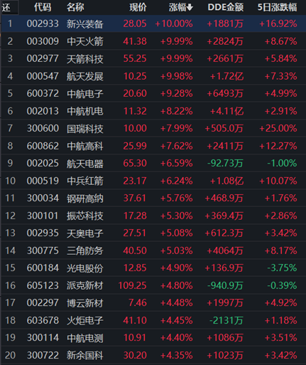 從個(gè)股來看,國(guó)防軍工行業(yè)98只交易的個(gè)股中,有90只上漲,其中,有4只個(gè)股漲停報(bào)收。