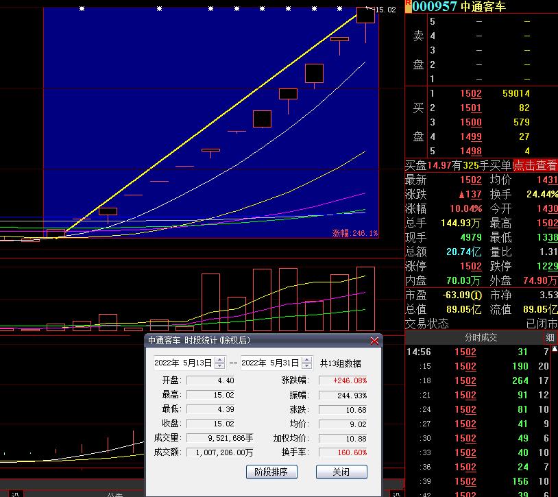 5月31日,核酸檢測(cè)車(chē)概念股中通客車(chē)再次漲停,收于15.02元/股,總市值為89.05億元。這是自5月13日起,中通客車(chē)收獲的第13個(gè)漲停,累計(jì)漲幅246.08%。