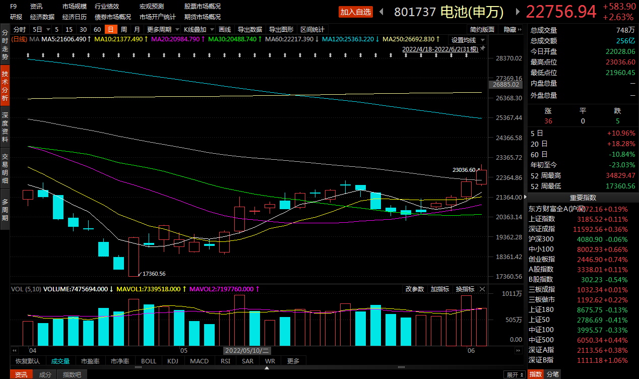 今日,申萬二級(jí)電池行業(yè)表現(xiàn)強(qiáng)勢(shì)。東方財(cái)富Choice數(shù)據(jù)顯示,截至6月2日11:30,該行業(yè)指數(shù)上漲2.63%,大幅跑贏上證指數(shù)(漲幅0.11%)。行業(yè)內(nèi)共37只個(gè)股上漲,占比超九成。具體到個(gè)股方面,蔚藍(lán)鋰芯漲停。