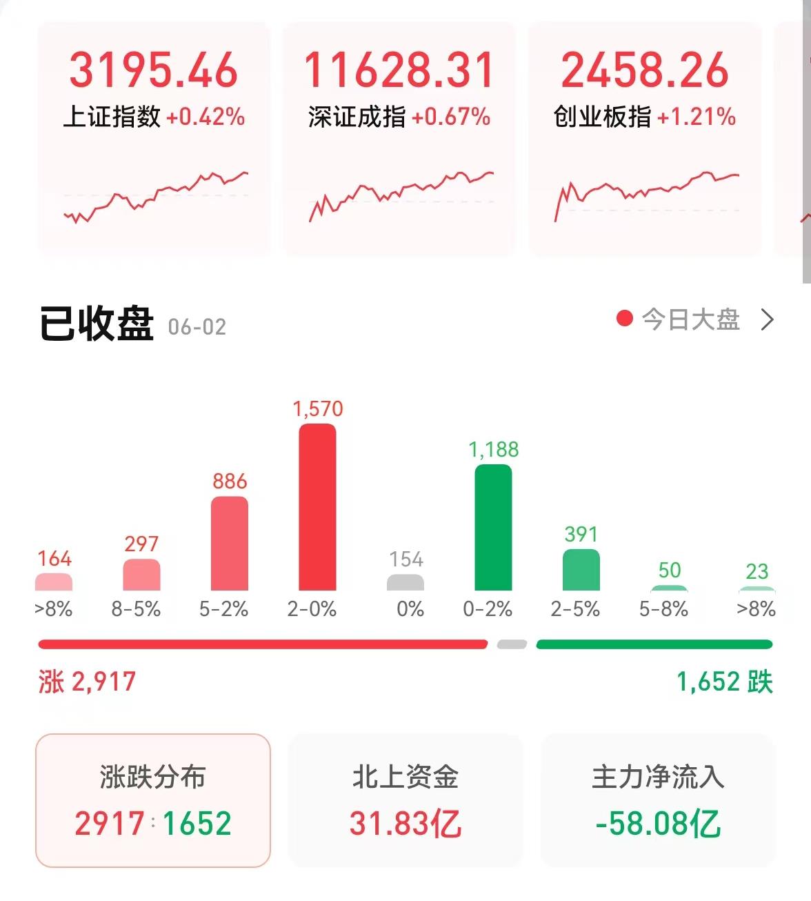 6月2日,三大股指集體收漲,截至收盤,上證指數(shù)漲0.42%報(bào)3195.46點(diǎn),深證成指漲0.67%報(bào)11628.31點(diǎn),創(chuàng)業(yè)板指漲1.21%報(bào)2458.26點(diǎn);兩市合計(jì)成交8917億元,北向資金凈買入31.83億元。總體來看,兩市個(gè)股漲多跌少。