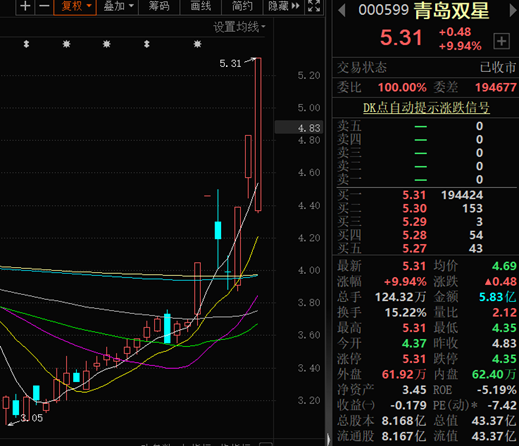 今日,青島雙星早盤一度長達1個多小時跌停,隨后逐步回升,至14:13成功封住漲停,收報5.31元,漲跌幅9.94%,振幅22.07%,換手率15.22%,成交額5.83億元。青島雙星股價近7個交易日5個漲停,區(qū)間累計漲幅為44.29%,累計換手率為54.04%。最新A股總市值與流通市值均為43.37億元。