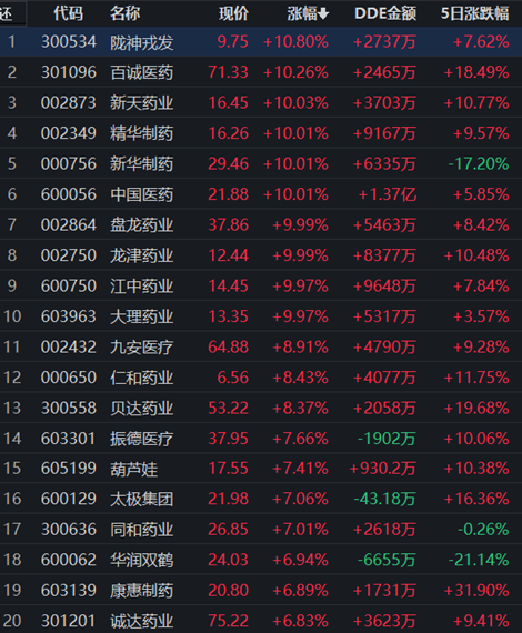 從個股來看,醫(yī)藥生物339只交易中的個股269只上漲,占比79.35,其中,有8只個股漲停報收。