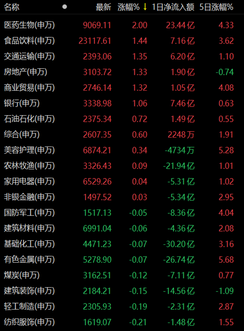 從申萬一級行業(yè)看,醫(yī)藥生物漲幅居前,收報9069.11點,漲幅達2.00%。