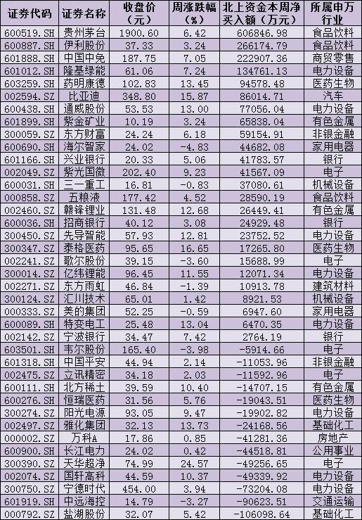 資金方面,北向資金本周累計(jì)凈買入金額達(dá)368.3億元,創(chuàng)年內(nèi)新高。從前十大成交活躍股來看,本周,貴州茅臺(tái)、伊利股份、中國中免、隆基綠能等4只個(gè)股,北向資金凈買入金額均超10億元。另外,鹽湖股份、中遠(yuǎn)???、寧德時(shí)代等個(gè)股遭北向資金凈賣出金額均超5億元。