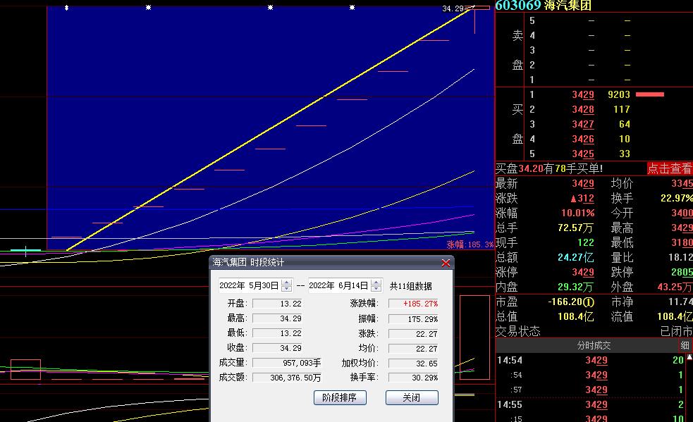 6月14日,熱門股海汽集團(tuán)再度漲停,截至收盤,報34.29元,總市值達(dá)108.4億元,走出了11連板,期間累計漲達(dá)185.27%。