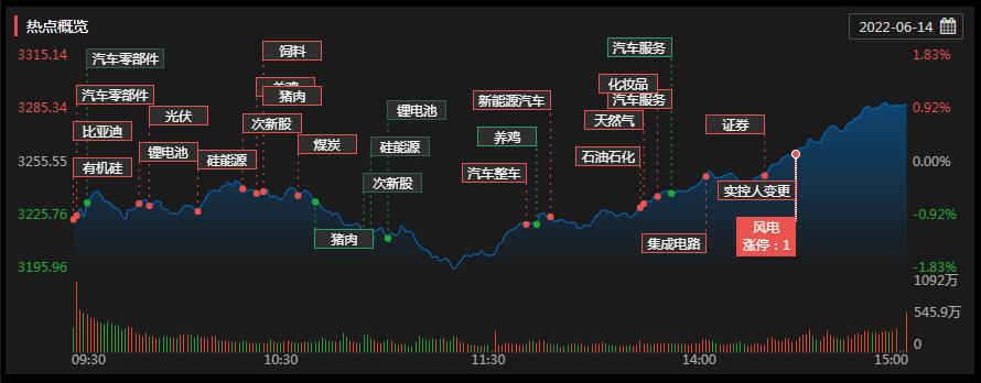 6月14日,三大股指低開高走,全線飄紅,截至收盤,上證指數(shù)漲1.02%報3288.91點,深證成指漲0.2%報12023.79點,創(chuàng)業(yè)板指漲0.07%報2548.31點;兩市合計成交10994億元,連續(xù)第3個交易日突破萬億元;北向資金凈買入39.44億元??傮w來看,兩市個股跌多漲少。