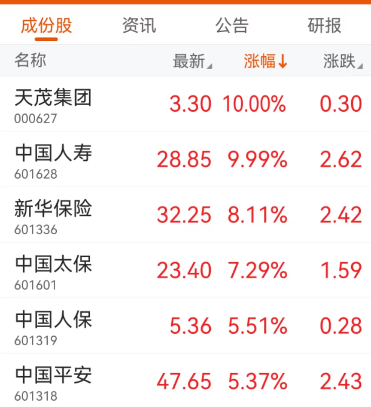截至6月15日收盤,中國人壽、新華保險(xiǎn)、中國太保、中國人保、中國平安分別上漲9.99%、8.1%、7.3%、5.5%、5.4%。此外,參股國華人壽的天茂集團(tuán)也出現(xiàn)漲停。詳見下圖:
