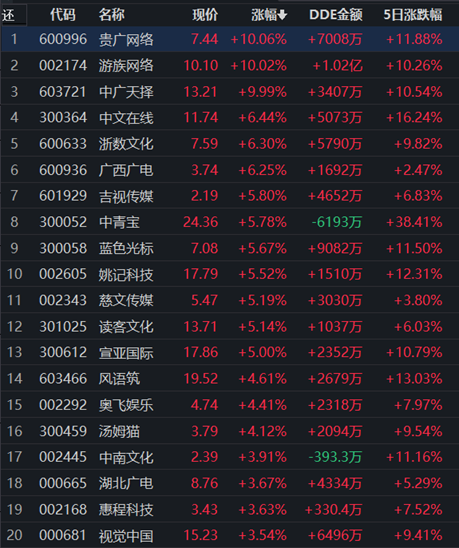 6月21日,傳媒行業(yè)漲幅居首,達(dá)1.09%。其中,貴廣網(wǎng)絡(luò)、游族網(wǎng)絡(luò)和中廣天擇等3只個股集體漲停。