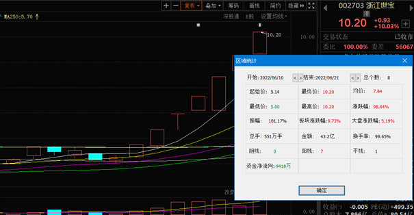 6月21日,熱門汽車零部件股浙江世寶再度漲停,這已是該股6月13日以來連續(xù)第7個漲停板,截至收盤,報10.20元,總市值達(dá)56.41億元。該股自6月10日以來,8個交易日累計漲幅達(dá)98.44%。