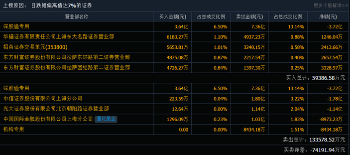盤(pán)后龍虎榜數(shù)據(jù)顯示,深股通賣(mài)出7.36億元并買(mǎi)入3.64億元,中信證券上海分公司賣(mài)出1.8億元,一機(jī)構(gòu)專(zhuān)用席位凈賣(mài)出8434萬(wàn)元。