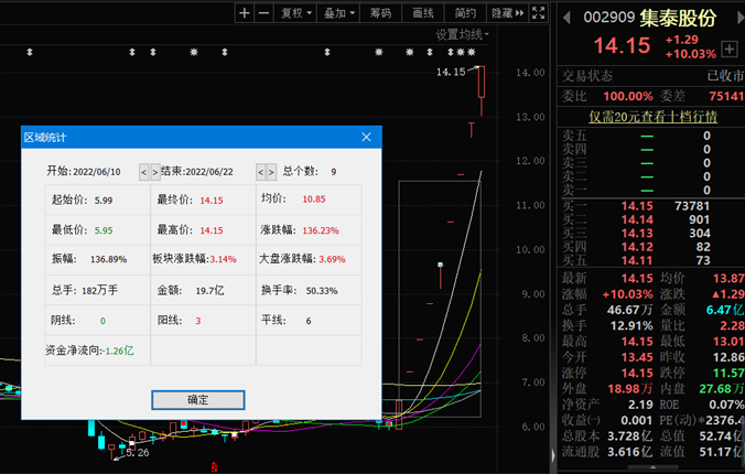 6月22日,集泰股份再度漲停,報(bào)14.15元,這是該股收獲的第9個(gè)漲停板,自6月10日以來(lái),截至6月22日,該股累計(jì)漲幅已達(dá)136.23%。