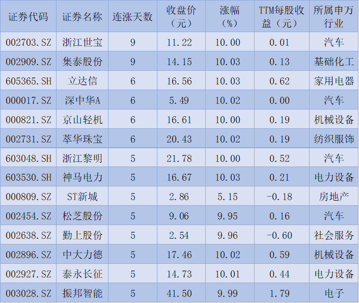 表:連續(xù)上漲5天且今日收盤(pán)漲停股一覽