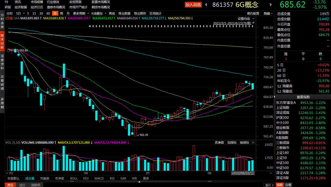 受利好消息等多重因素影響,近期A股東方財(cái)富6G概念板塊漲幅較大。自4月27日大盤反彈以來(lái),截至6月22日收盤,6G概念板塊期間累計(jì)上漲21.05%,大幅跑贏上證指數(shù)(期間累計(jì)漲幅為13.19%)。