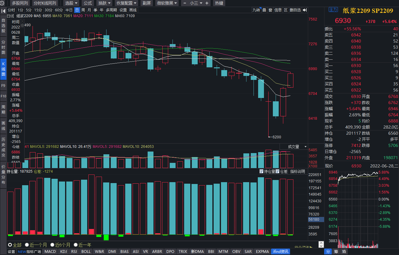 受現(xiàn)貨價(jià)格強(qiáng)勁支撐,紙漿期貨價(jià)格今日大幅上漲。同花順數(shù)據(jù)顯示,6月28日,上期所9月份交貨的紙漿期貨主力合約(紙漿2209合約)上漲5.64%,創(chuàng)6個(gè)多月以來(lái),最大單日漲幅,收盤價(jià)為6930元/噸,在上期所各期貨品種中漲幅位居前列。且本周以來(lái),該期貨主力合約已上漲7.71%。