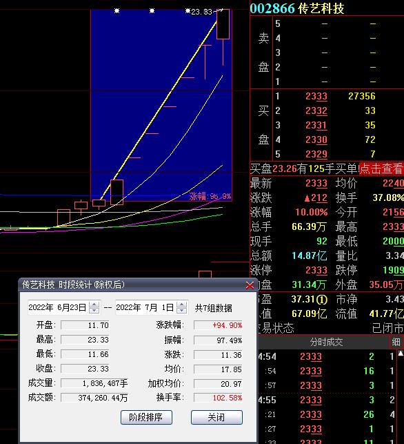 7月1日,熱門股傳藝科技再度漲停,截至收盤,報23.33元,連續(xù)7個交易日漲停,期間累計漲達94.9%。