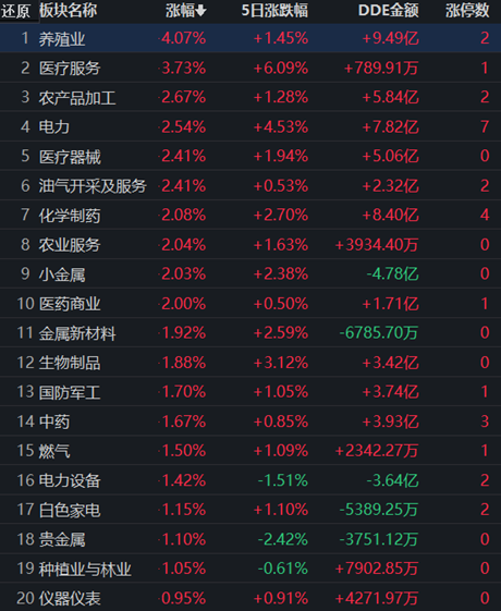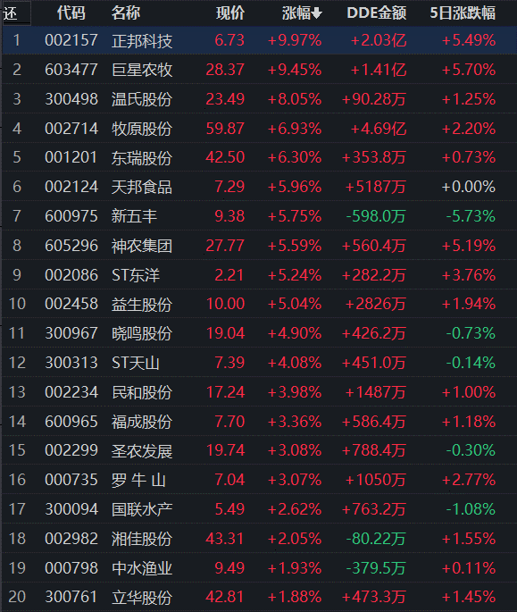 從領(lǐng)漲的養(yǎng)殖業(yè)看,截至7月4日11:30,行業(yè)交易中的26只個股,有25只上漲,其中正邦科技封漲停板。從資金流向看,養(yǎng)殖業(yè)上午大單資金凈流入額達(dá)9.49億元,居各行業(yè)第1位。