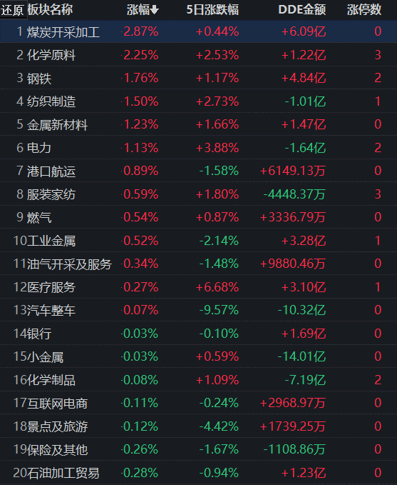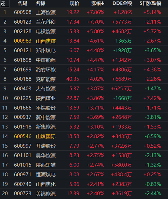 從領(lǐng)漲的煤炭開采加工行業(yè)看,截至7月5日11:30,行業(yè)交易中的33只個(gè)股,有31只上漲,其中,上海能源、蘭花科創(chuàng)和電投能源漲幅超5%。從資金流向看,煤炭開采加工上午大單資金凈流入額達(dá)6.09億元,居各行業(yè)第1位。