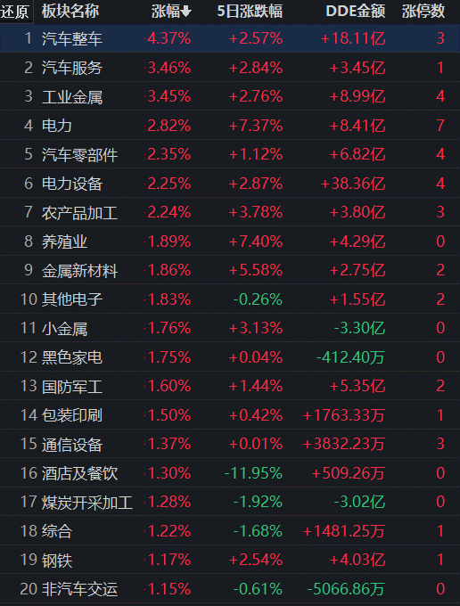 同花順行業(yè)方面,截至7月7日11:30,76類行業(yè)中有58類上漲,占比76.32%。汽車整車行業(yè)居漲幅榜首,漲幅達4.37%,此外,汽車服務和工業(yè)金屬行業(yè)漲幅也均超3%;跌幅居首的行業(yè)是服裝家紡,下跌1.37%。