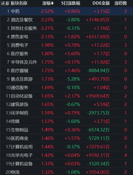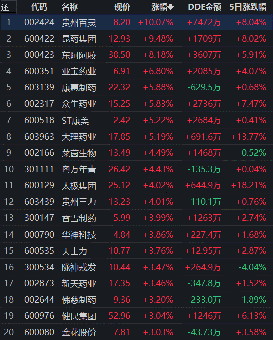 從領(lǐng)漲的中藥行業(yè)看,截至7月8日11:30,行業(yè)交易中的73只個(gè)股,有70只上漲,有7只個(gè)股漲幅超5%,有2只個(gè)股漲停。從資金流向看,中藥行業(yè)上午大單資金凈流入額達(dá)3.15億元,居各行業(yè)第8位。
