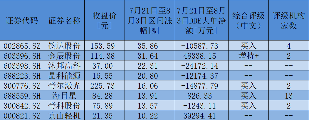 表:7月21日至8月3日,TOPCON電池概念板塊期間累計(jì)漲幅超10%個(gè)股一覽