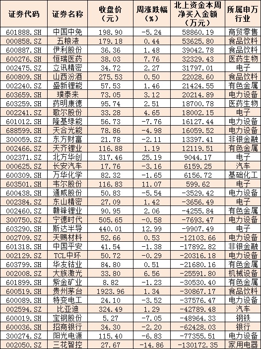 資金方面,北向資金本周累計(jì)凈賣出金額達(dá)12.33億元。從前十大成交活躍股來看,中國中免、五糧液、伊利股份、恒瑞醫(yī)藥、立訊精密等個(gè)股,北向資金凈買入金額均超3億元。另外,三花智控、陽光電源、招商銀行、寶鋼股份、比亞迪等個(gè)股遭北向資金凈賣出金額均超4億元。