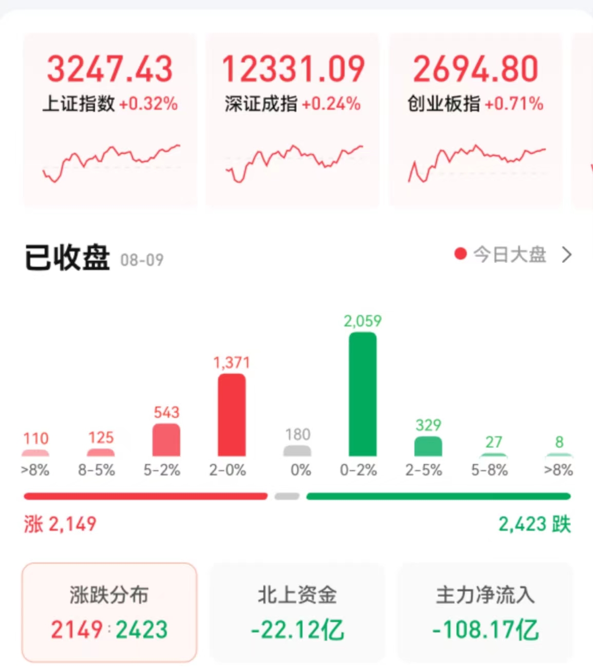 8月9日,三大股指全線飄紅,截至收盤,上證指數(shù)漲幅達0.32%報3247.43點,實現(xiàn)四連陽;深證成指漲幅達0.24%報12331.09點,創(chuàng)業(yè)板指漲幅達0.71%報2694.8點;兩市合計成交9530億元,北向資金凈賣出22.12億元??傮w來看,A股個股跌多漲少。