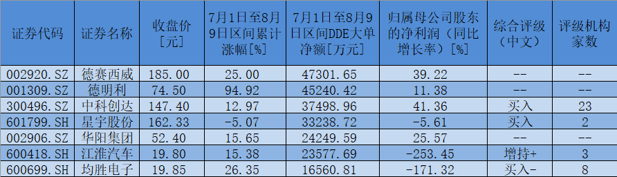 表:7月1日至8月9日,無人駕駛概念板塊期間累計(jì)獲大單資金凈流入額超億元個(gè)股一覽