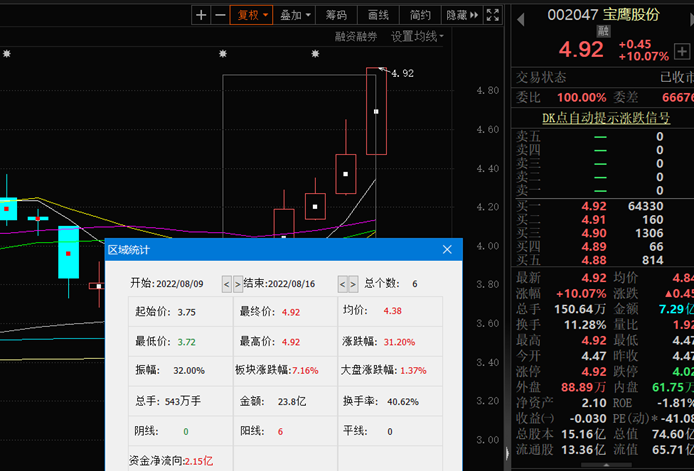8月16日,寶鷹股份漲10.07%,報(bào)4.92元。該股自8月9日以來(lái),截至8月16日已連續(xù)6個(gè)交易日上漲,累計(jì)漲幅達(dá)31.20%。最新該股A股總市值達(dá)74.60億元,A股流通市值65.71億元。
