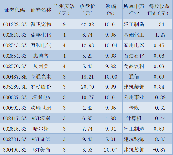 表:連續(xù)上漲3天且今日收盤漲停股一覽