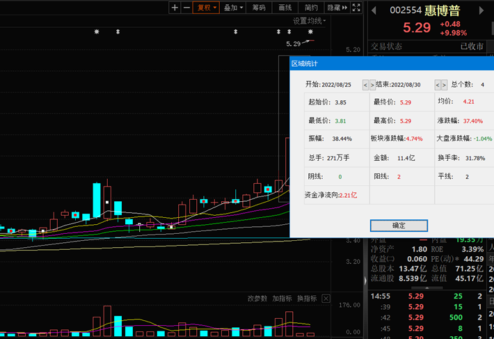 8月30日,惠博普漲9.98%,報(bào)5.29元。該股自8月25日以來,截至8月30日已連續(xù)4個(gè)交易日上漲,累計(jì)漲幅達(dá)37.40%。該股最新A股總市值達(dá)71.25億元,A股流通市值45.17億元。