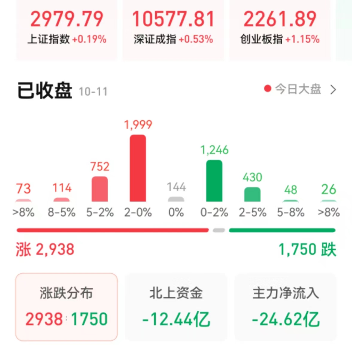 周二(10月11日),A股三大指數集體收漲。截至收盤,上證指數漲0.19%報2979.79點,深證成指漲0.53%報10577.81點,創(chuàng)業(yè)板指漲1.15%報2261.89點;兩市合計成交5638億元,北向資金凈賣出12.44億元??傮w來看,A股個股漲多跌少。