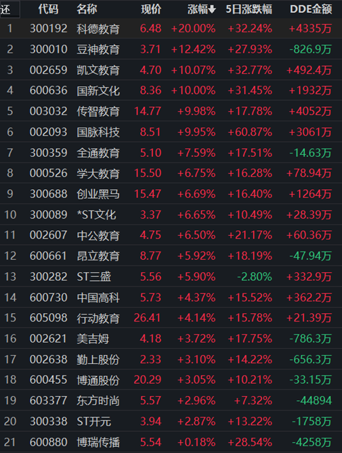 從漲幅居首的教育行業(yè)看,截至10月17日11:30,該行業(yè)交易的21只個股全線上漲,其中13只漲幅超5%。從資金流向看,該行業(yè)今天上午大單資金凈流入額達7220.06萬元,居行業(yè)第5位。