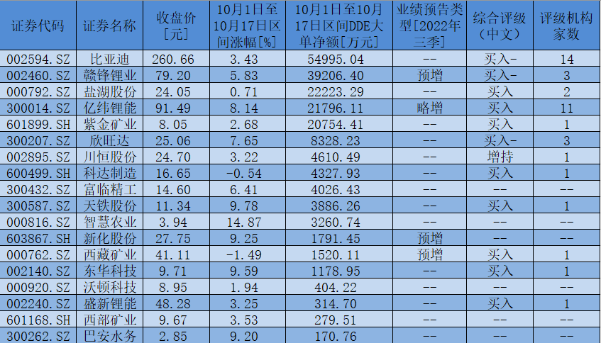 表:10月份以來,截至10月17日,獲大單資金凈流入的鹽湖提鋰概念股一覽