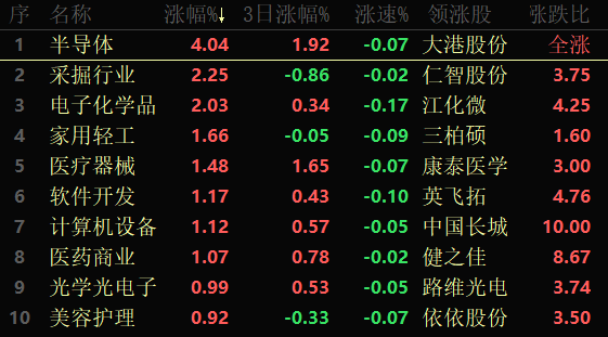 從漲幅居首的半導(dǎo)體行業(yè)看,截至10月20日11:30,該行業(yè)交易中的126只個(gè)股全線上漲,其中31只漲幅超5%。從資金流向看,該行業(yè)今天上午大單資金凈流入額達(dá)13.9億元,居行業(yè)第1位。