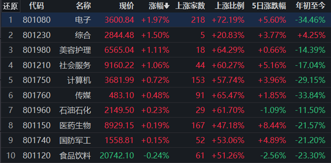31類(lèi)申萬(wàn)一級(jí)行業(yè)中,有9類(lèi)上漲,占比29.03%,其中,電子行業(yè)漲1.97%,漲幅居首;下跌方面,電力設(shè)備行業(yè)居首,跌幅達(dá)2.78%。