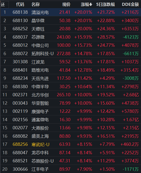 具體來(lái)看,同花順行業(yè)中半導(dǎo)體及元件行業(yè)漲幅達(dá)4.09%,獲得17.62億元大單資金的凈流入,居第一位。行業(yè)168只交易中的個(gè)股,有158只上漲,占比94.05%,其中,49只個(gè)股漲幅超5%。