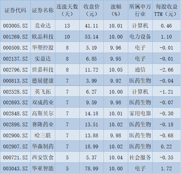 表:連續(xù)上漲6天且今日收盤(pán)漲停個(gè)股一覽