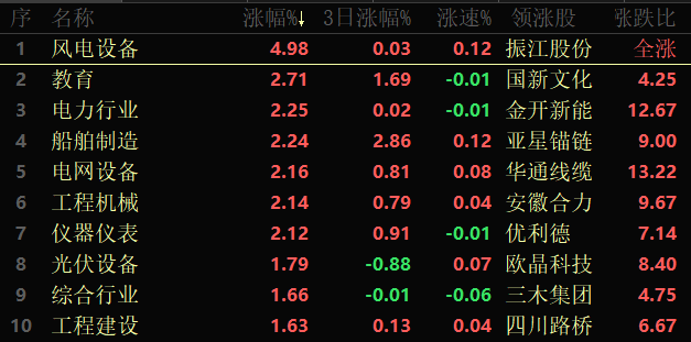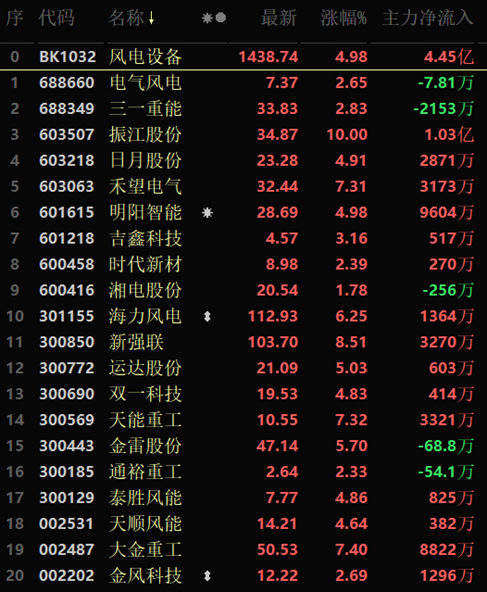 從漲幅居首的風(fēng)電設(shè)備行業(yè)看,截至10月21日11:30,該行業(yè)交易中的20只個股全線上漲,其中8只漲幅超5%。從資金流向看,該行業(yè)今天上午大單資金凈流入額達(dá)4.45億元,居行業(yè)第4位。