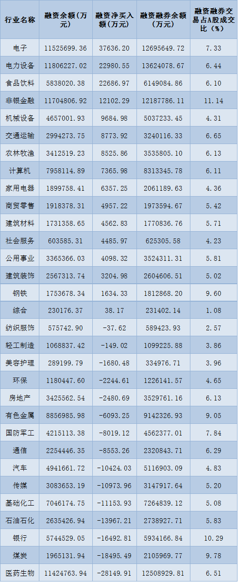 表:10月20日申萬一級行業(yè)兩融交易情況: