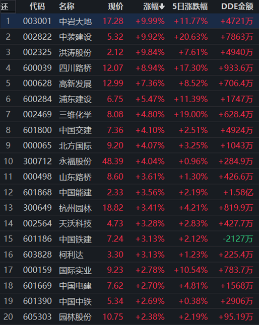 10月21日,申萬一級行業(yè)中建筑裝飾行業(yè)領漲,漲幅達1.45%,獲得2.66億元大單資金的凈流入,居第三位。行業(yè)157只交易中的個股,有92只上漲,占比58.60%,其中,6只個股漲幅超5%。