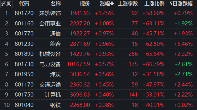 31類申萬一級行業(yè)中,有15類上漲,其中,建筑裝飾行業(yè)漲1.45%,居首;下跌方面,美容護理行業(yè)居首,跌幅達3.05%。