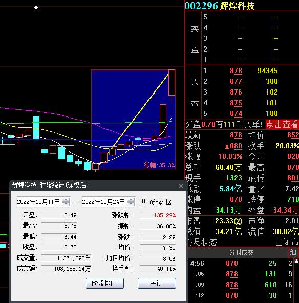 10月24日,熱門股輝煌科技再度漲停,截至收盤,報(bào)8.78元,連續(xù)2個交易日漲停,實(shí)現(xiàn)十連漲,期間累計(jì)漲幅達(dá)35.29%。