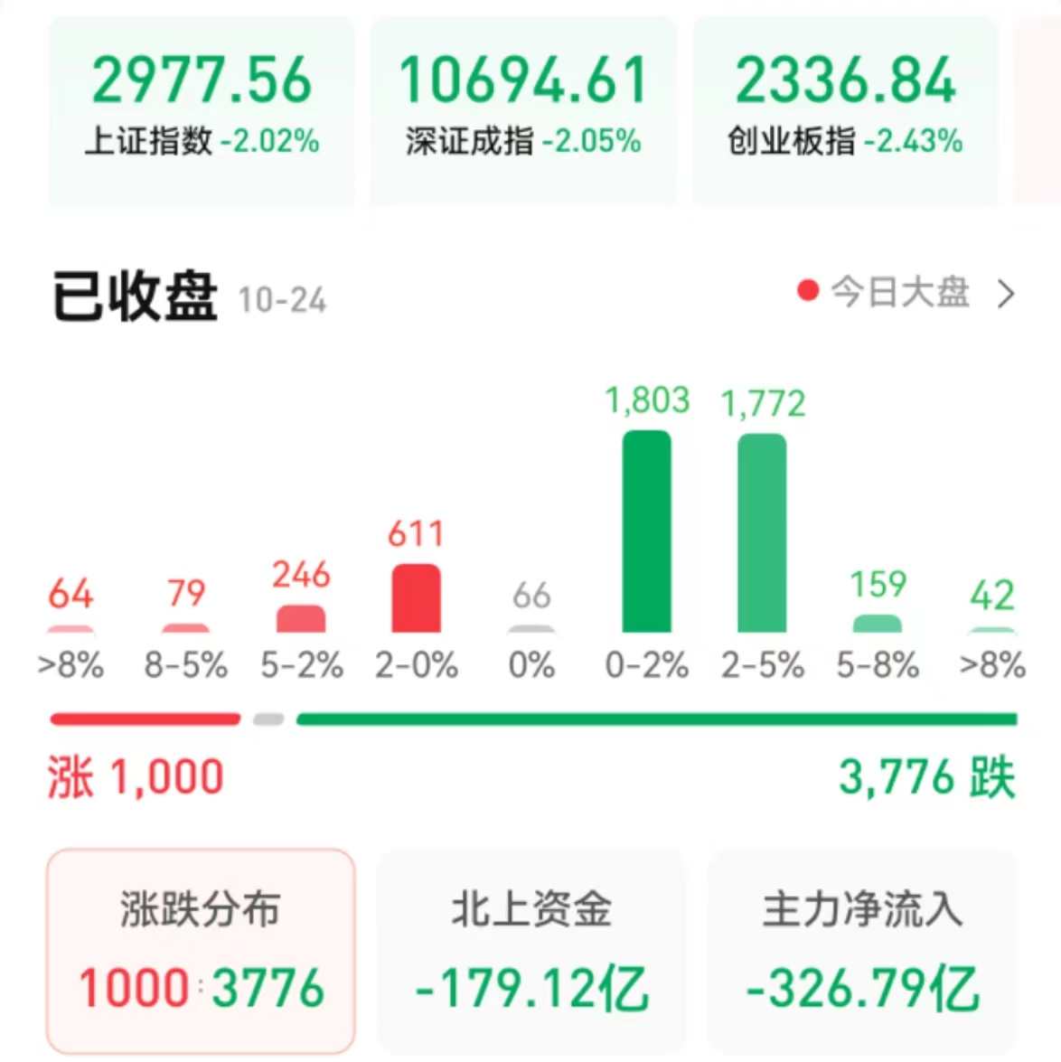 周一(10月24日),A股三大指數(shù)集體收跌,跌幅均超2%。截至收盤,上證指數(shù)報(bào)2977.56點(diǎn)失守3000點(diǎn),跌幅2.02%;深證成指報(bào)10694.61點(diǎn),跌幅2.05%;創(chuàng)業(yè)板指報(bào)2336.84點(diǎn),跌幅2.43%。滬深兩市合計(jì)成交額8810億元;北向資金凈賣出179.12億元;總體來看,A股個股跌多漲少。
