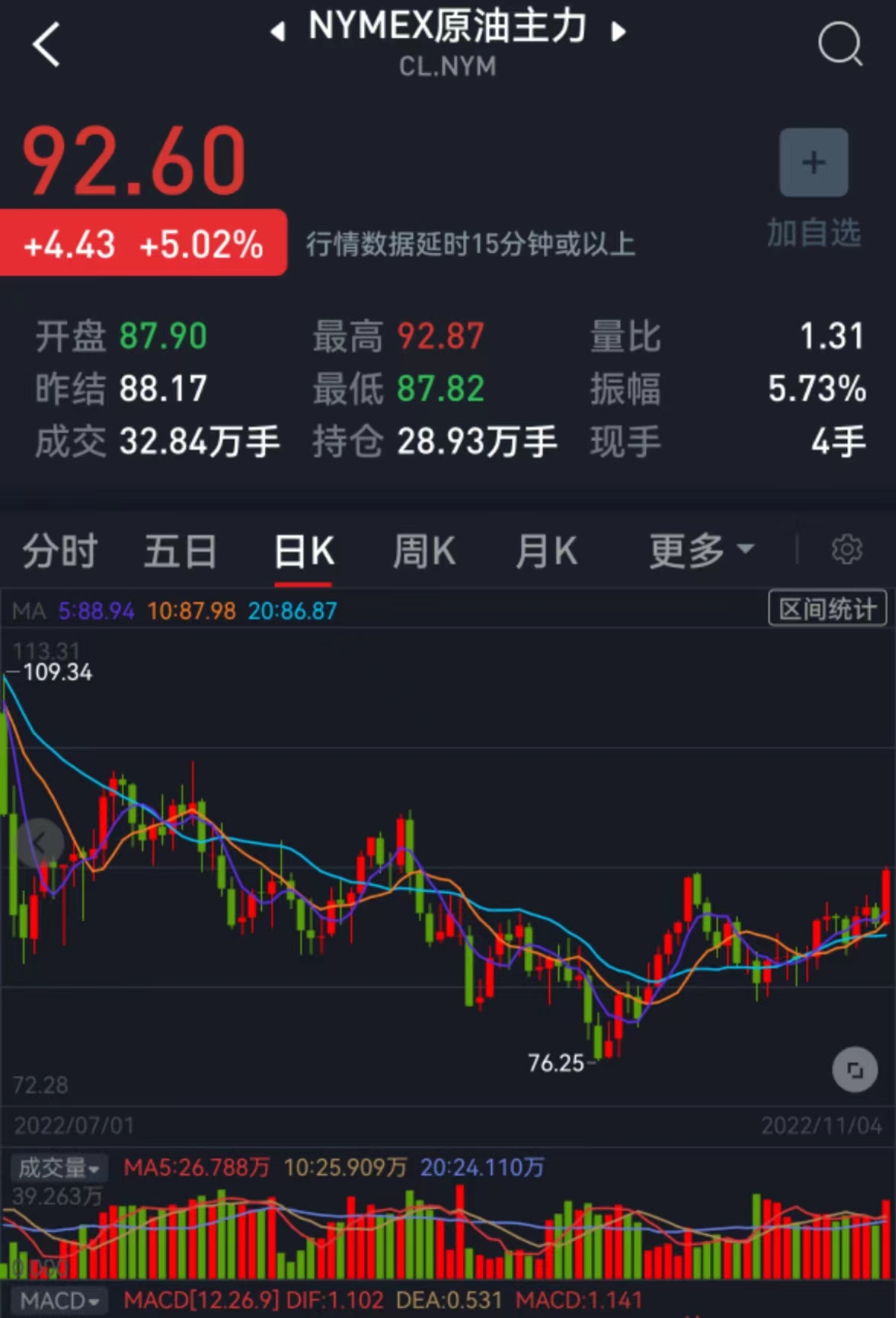 周五,國際油價(jià)全線上漲,美油12月合約漲5.02%,報(bào)92.60美元/桶。布油明年1月合約漲4.31%,報(bào)98.75美元/桶。本周,美油12月合約漲5.35%,布油明年1月合約漲5.31%。